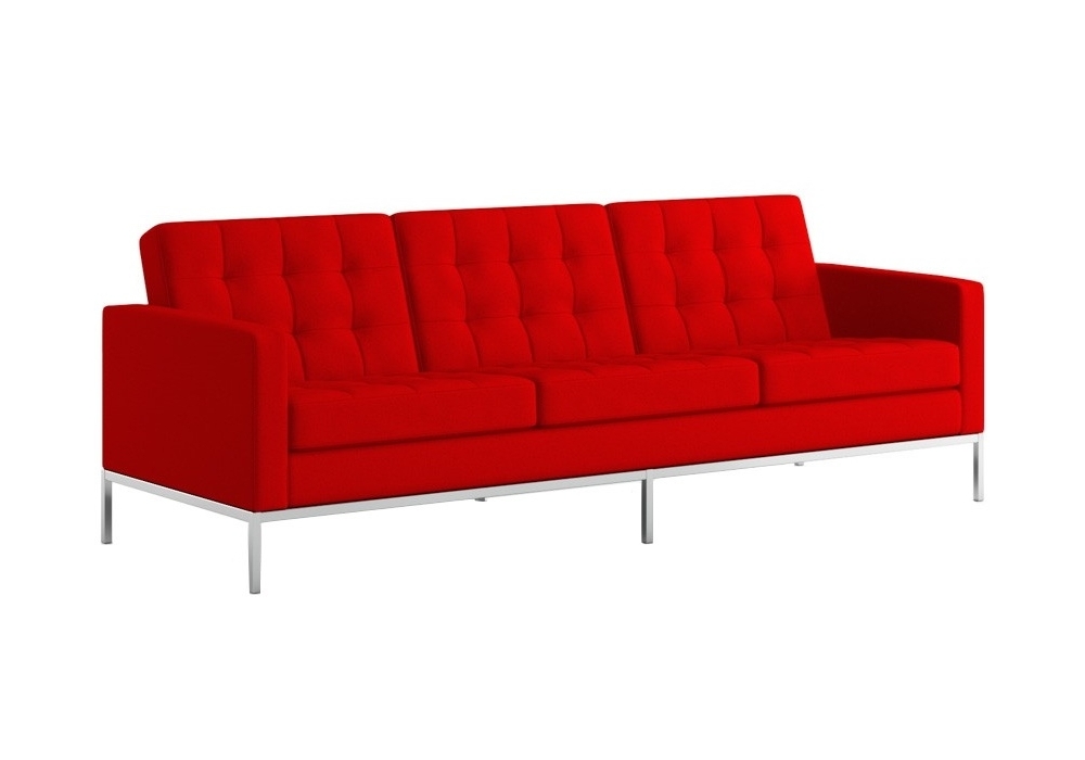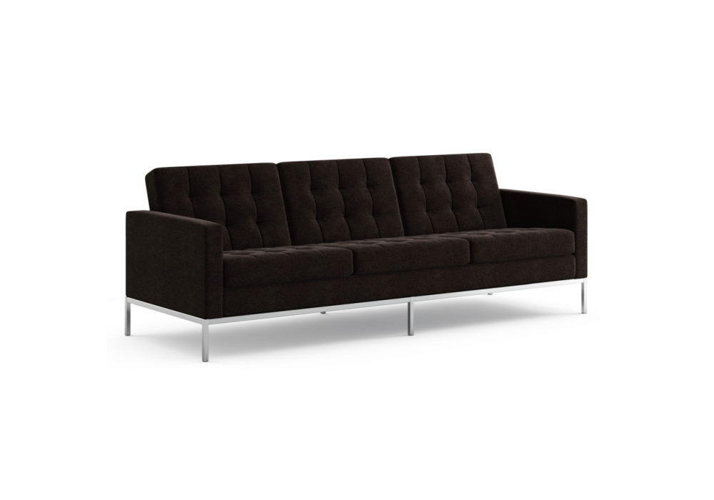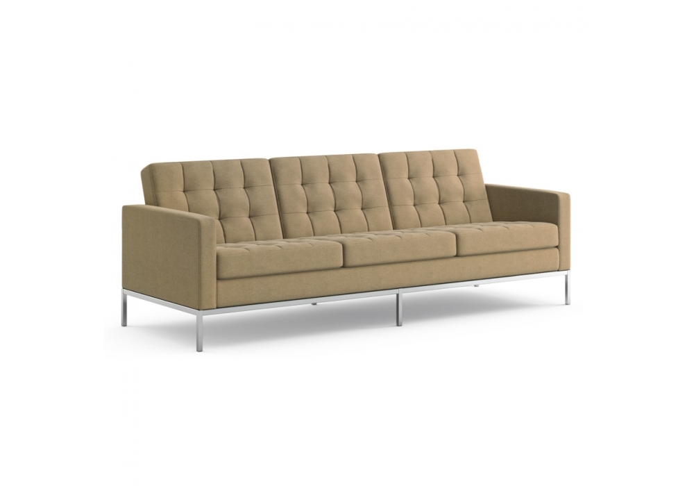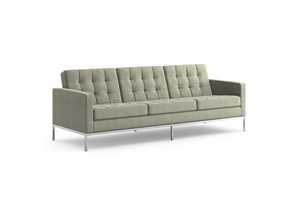 Florence designed by Florence Knoll for Knoll is a 3-seater sofa with a square section tubular steel frame with a polished or painted chrome finish. The seat and back cushions contain shaped foam in various densities and lined with polyester fibers to increase comfort. The cushions are quilted with box stitching. The seat and back cushions in leather have quilted squares with buttons while those in fabric have quilted squares without buttons. Upholstery in fabric or leather.