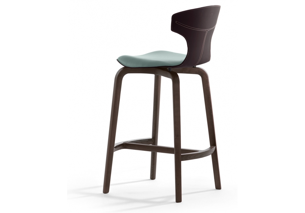 Montera designed by Roberto Lazzeroni for Poltrona Frau is stool collection available in two versions: saddle-leather shell with inside upholstery leather or fully leather, single or two-tone. Leather and saddle-leather with clean-cut edges are sewn together with contrasting thread. The full leather version features tone-ontone stitching. In wood version, the stools feature plastic caps and a metal sheet with a gunmetal grey finish, which protects the upper part of the tubular footrest. In steel version, the stools have 4 tapering tubular feet connected with a circular footrest ring with the same finish as the base equipped with an anti-scratch protective plate in brushed stainless steel.