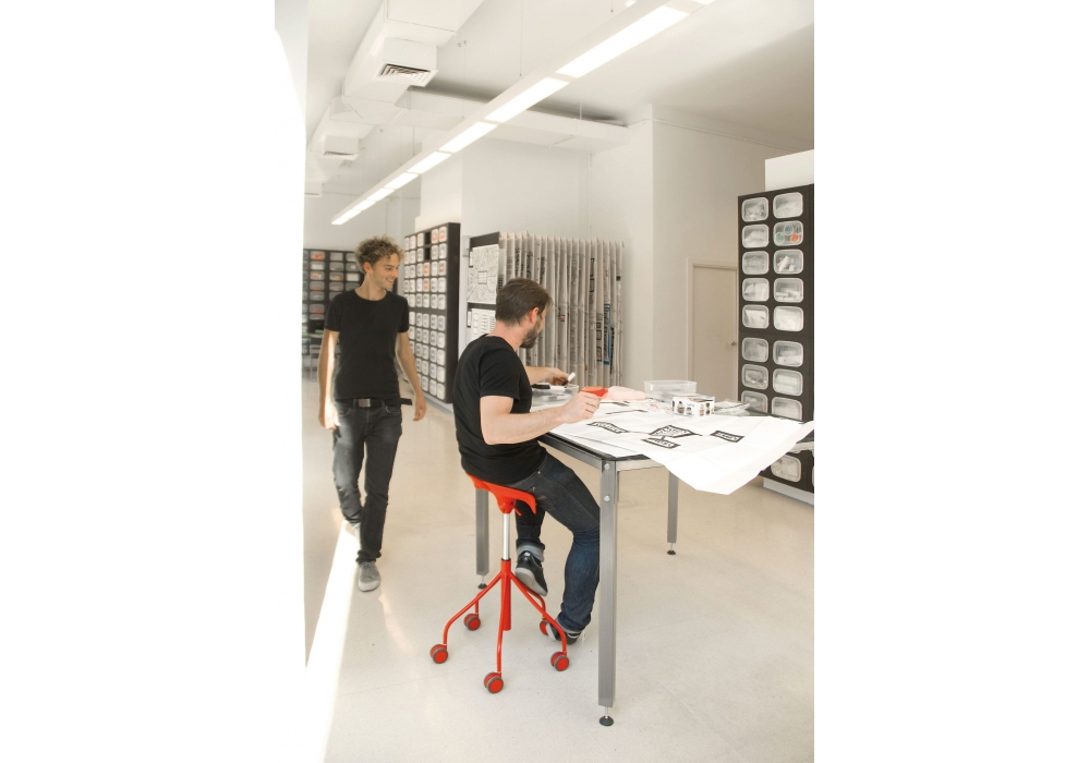 Binaria designed by Jordi Badia and Otto Canalda for BD Barcelona is a stool with structure and lever in polyester powder coated steel and satin finish. The seat is in injected polyurethane with gas piston for height adjustment. Available in different finishes.