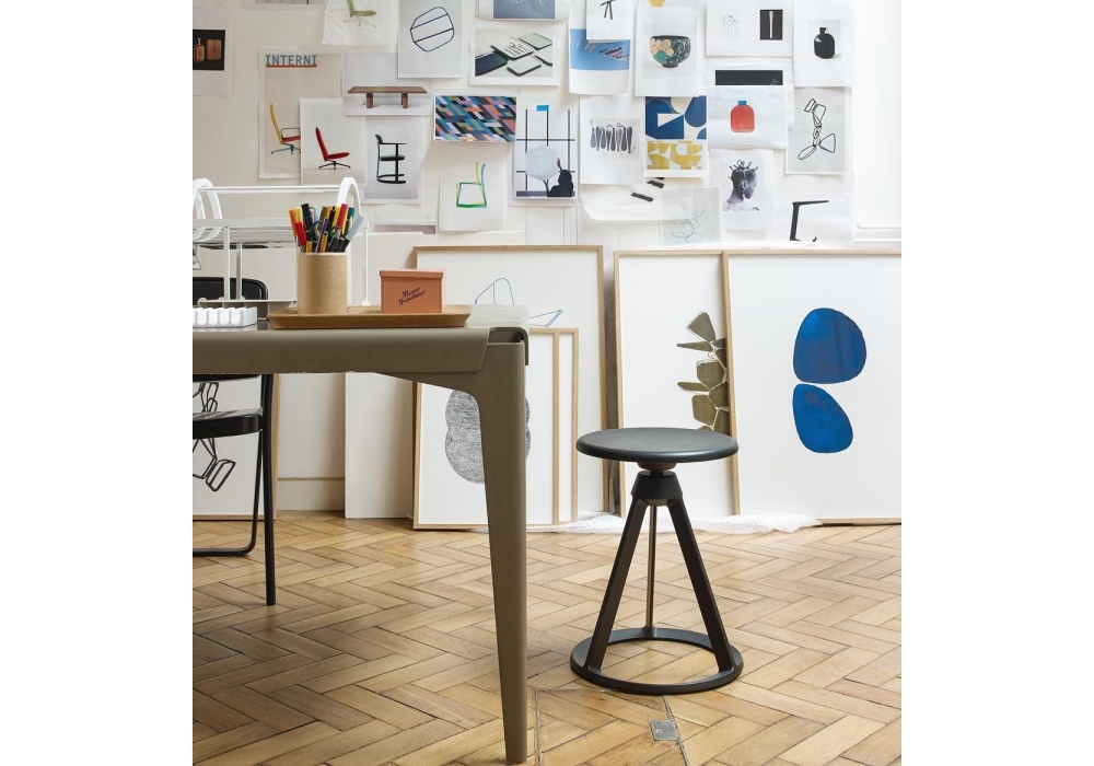 Piton designed by Edward Barber & Jay Osgerby for Knoll is a stool with a base in die-cast aluminum with painted steel fixing elements. Swivel seat in die-cast aluminum; fixed to the base with steel hooks. Available in polished steel or black painted.