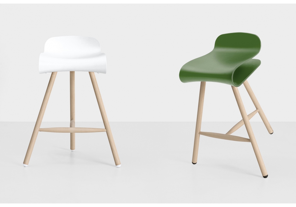 BCN designed by Harry&Camila for Kristalia is a stool with wooden base and shell made of PBT, a plastic that is both strong and flexible.