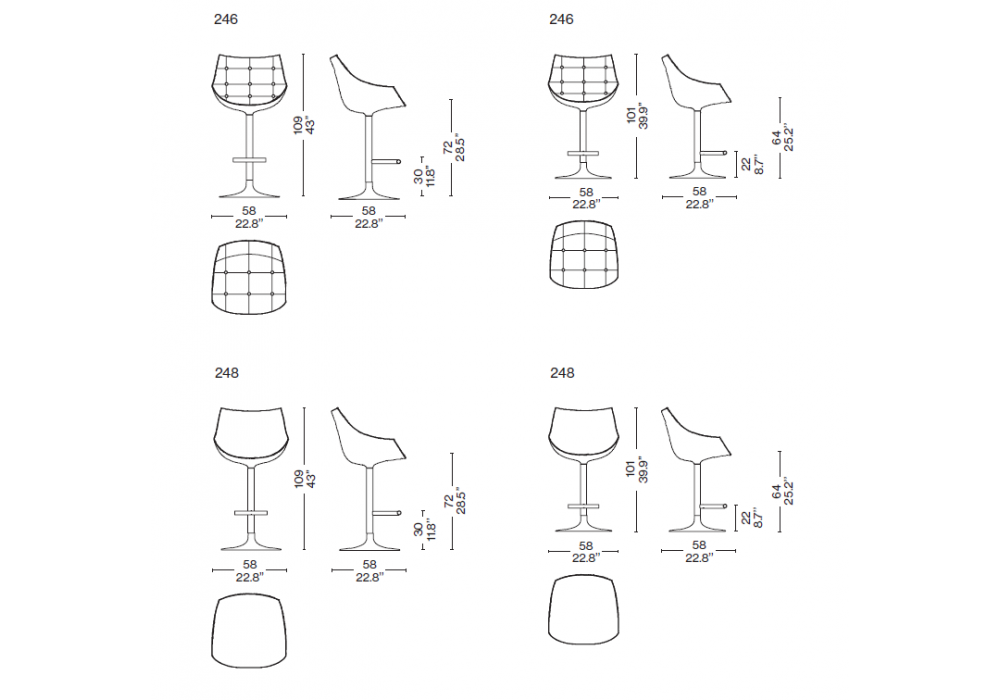 246/248 Passion designed by Philippe Starck for Cassina is a stool available in two heights. Tha base is in the same finish of the shell or in polished aluminum. The footrest is chrome-plated for all finishes. Front upholstery with cover in leather or fabric.