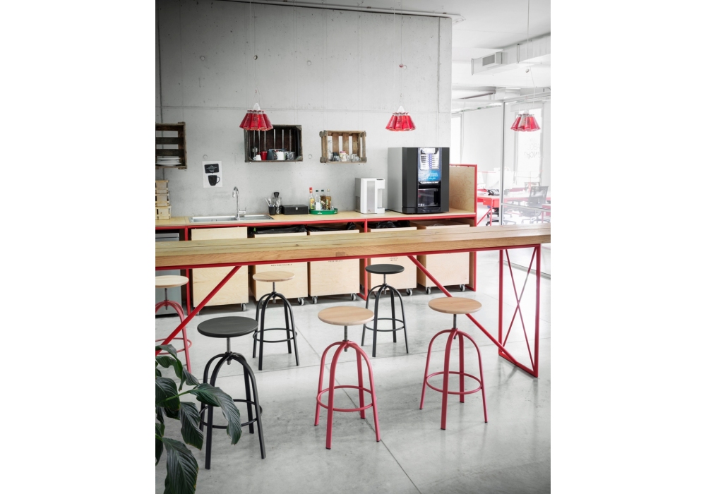 Ferrovitos designed by Paolo Cappello for Miniforms is a stool with metal structure and wooden seat. The metal screw under the seat allows a 20cm lifting range of the same seat. Available in different finishes.