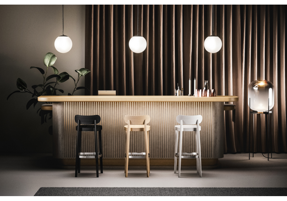 118 MH / MHT designed by Sebastian Herkner for Thonet is a bar stool with structure in solid beech wood, in different finishes. Seat in shaped plywood and chromed footrest. Also available in 2 heights.