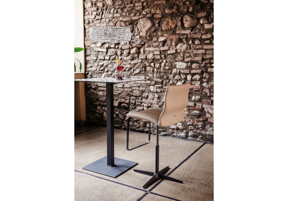 Victor X designed by Alessio Bassan for Cattelan Italia is a swivel stool with adjustable height. Upholstery available in fabric, synthetic nubuck, micro nubuck, synthetic leather or soft leather. 4 spokes base in polished aluminium and column, footrest and gas piston in chromed steel or with base plate, column, and footrest in black or titanium embossed lacquered steel and gas piston in chromed steel.