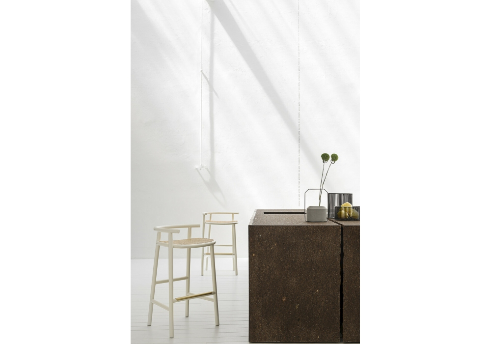Single Curve designed by Nendo for Gebrüder Thonet Vienna is a stool made of curved beech, available in different finishes. Seat in plywood or Vienna straw. Footrest bar covered in brass.