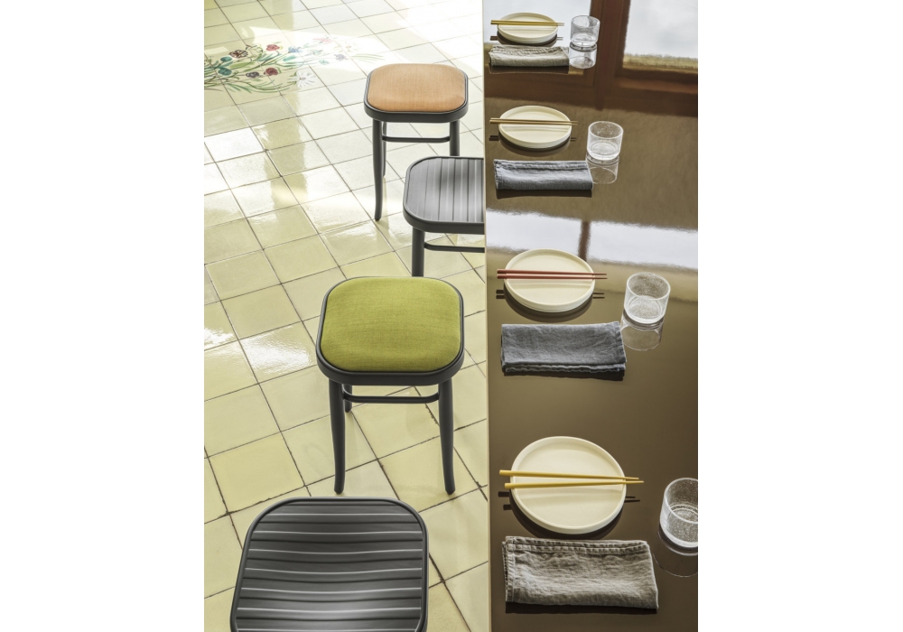 Vienna 144 designed by Gebrüder Thonet Vienna is a low stool made of bent beech, available in different finishes. Seat in embossed plywood or Vienna straw.