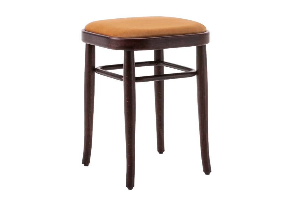 Vienna 144 designed by Gebrüder Thonet Vienna is a stool made of bent beech, available in different finishes. Padded seat with fabric or leather upholstery.