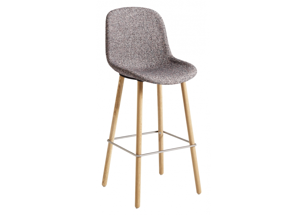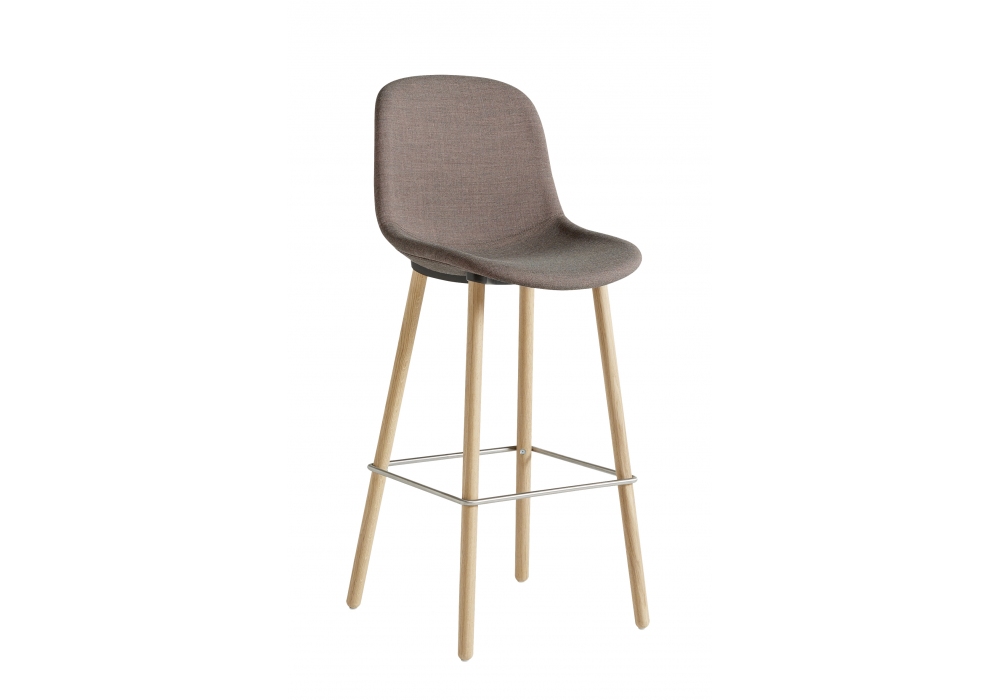 Neu 12 designed and produced by Hay is a bar stool with shell upholstered in leather or fabric, legs in oak wood and footrest in die-cast aluminum powder coated in soft black powder coating or in stainless steel. Available in different dimensions and upholstery.