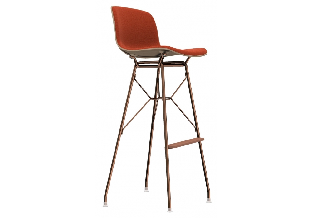 Troy Wireframe Beech designed by Marcel Wanders for Magis is a stool with structure in gilded, coppered or painted steel rod. Seat in beech with front padded in fire-retardant polyurethane foam and covered in fabric or leather. Available in different finishes and two sizes.