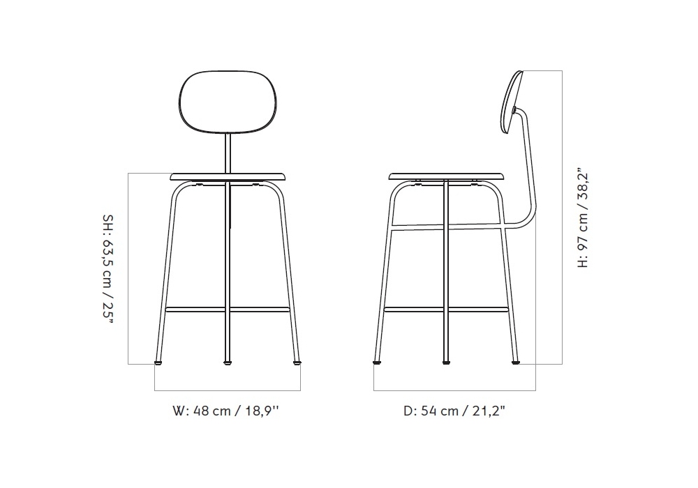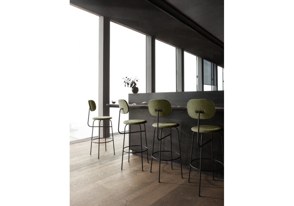 Afteroom Counter Plus designed by Afteroom Studio for Audo Copenhagen is a stool made in black powder coated tubular steel, padded seat with fabric or leather covering, padded backrest in the same finish as the seat or in walnut. Available in different finishes and sizes.