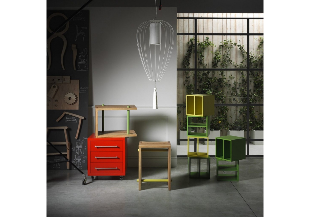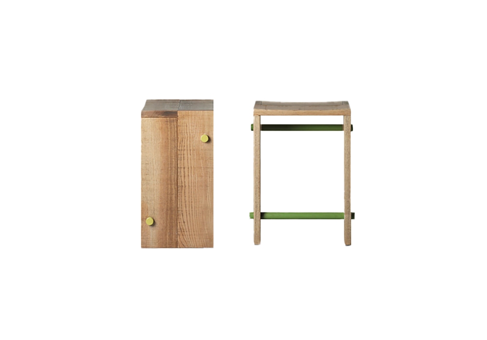 Bertillo designed by L'Ottocento is a handcrafted ash stool with two 3 cm thick planks that turn on three sides. The construction is completed by two colored pegs positioned symmetrically so as to become, the upper one a practical handle and the lower one a comfortable footrest.