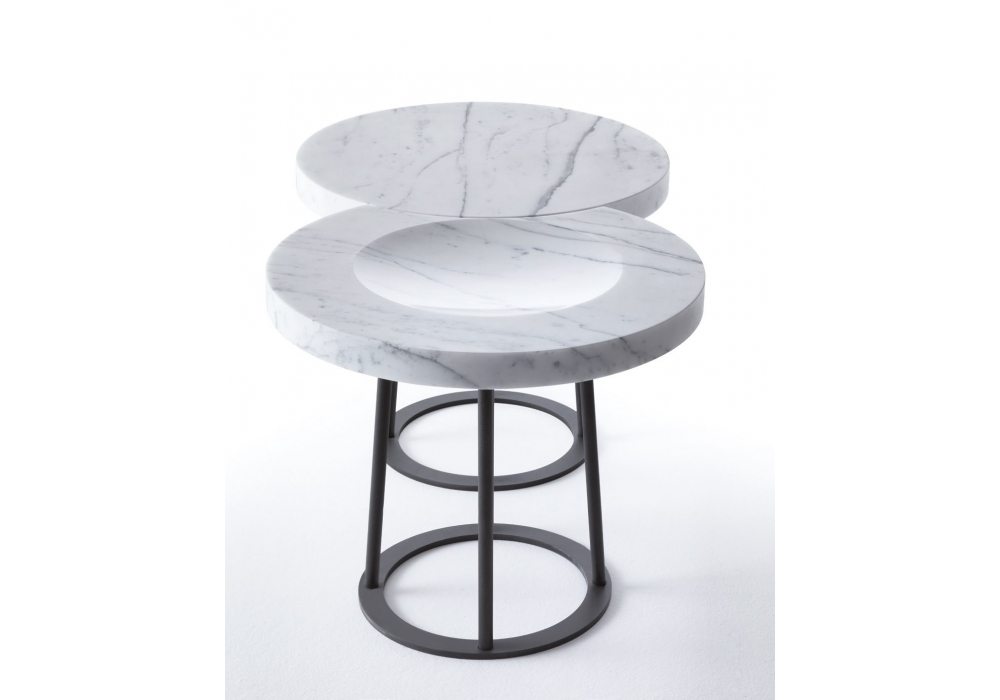 Moon designed by Enzo Berti for Kreoo is a stool with matt black metal structure and circular top made of marble or wood essence.