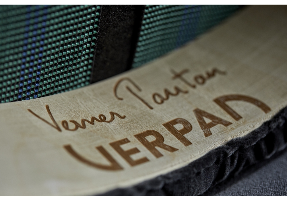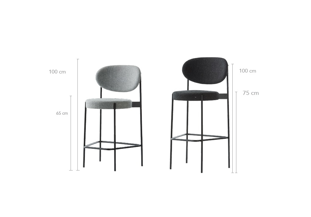 Series 430 designed by Verner Panton for Verpan is a set of 2 bar stools with metal structure in brass finish with felt feet. Back and seat completely padded and covered in different fabrics or leathers. Available in two dimensions.