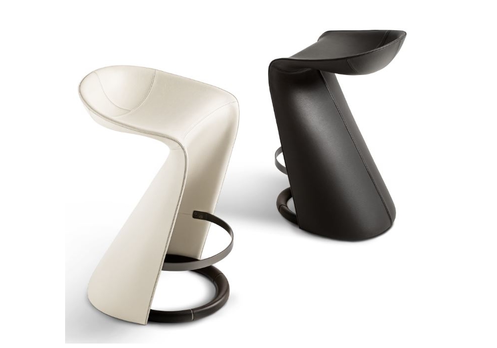 Skirt designed by M2Atelier for Giorgetti is a stool with ring base in solid ash, available in various finishes. The footrest is in pewter finish metal. The upholstery is in leather in numerous colours. Also available in two heights.