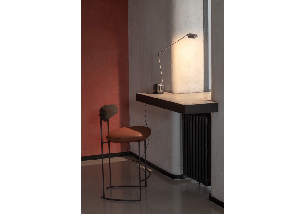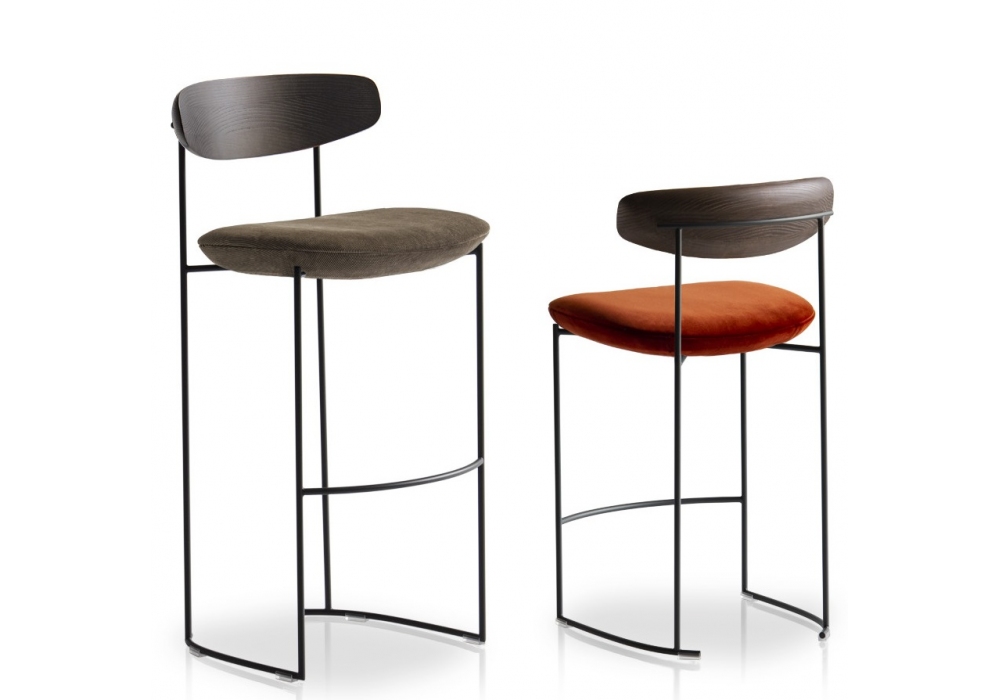 Keel designed by M + V for Potocco is a stool with structure in embossed painted metal rod, back in solid ash and seat upholstered in fire retardant polyurethane foam with upholstery in various fabrics, leathers or eco-leathers.