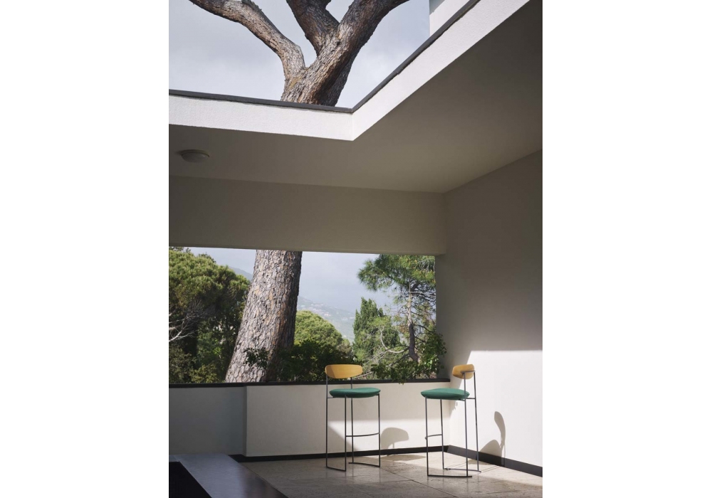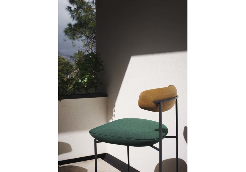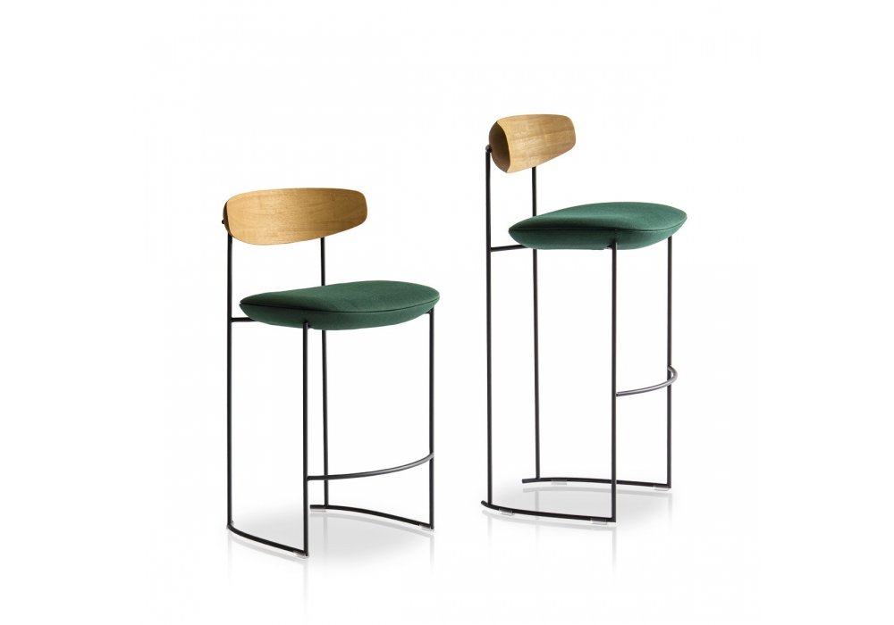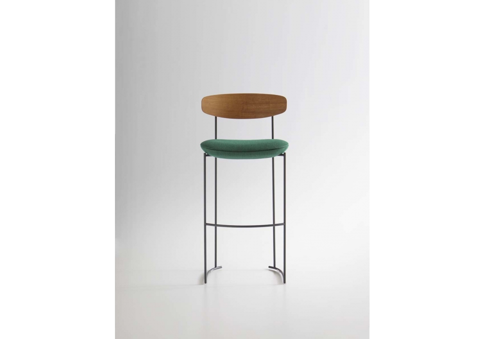 Keel Outdoor designed by M + V for Potocco is an outdoor stool with structure in embossed painted metal rod, back in solid Iroko and seat upholstered in fire retardant polyurethane foam with upholstery in various fabrics.
