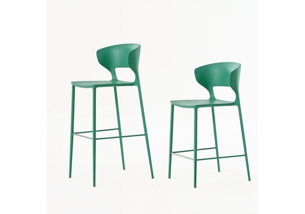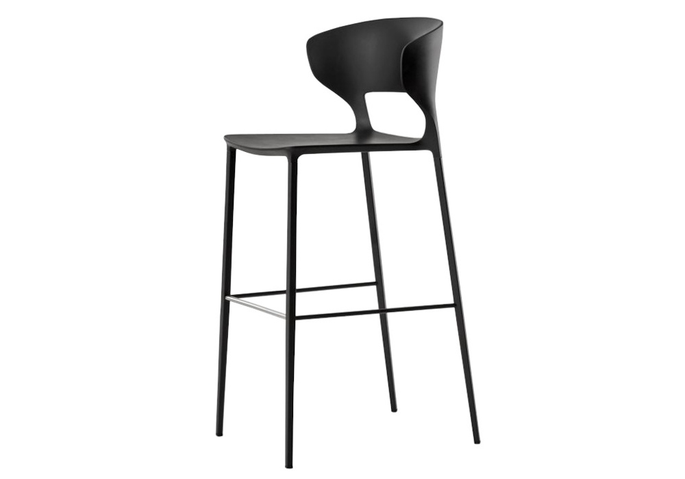 Koki 708 designed by Pocci e Dondoli for Desalto is a stool with seat made of painted polyurethane, internal structure and legs in steel, footrest in tubular steel covered with a stainless steel profile. Available in different finishes and sizes.