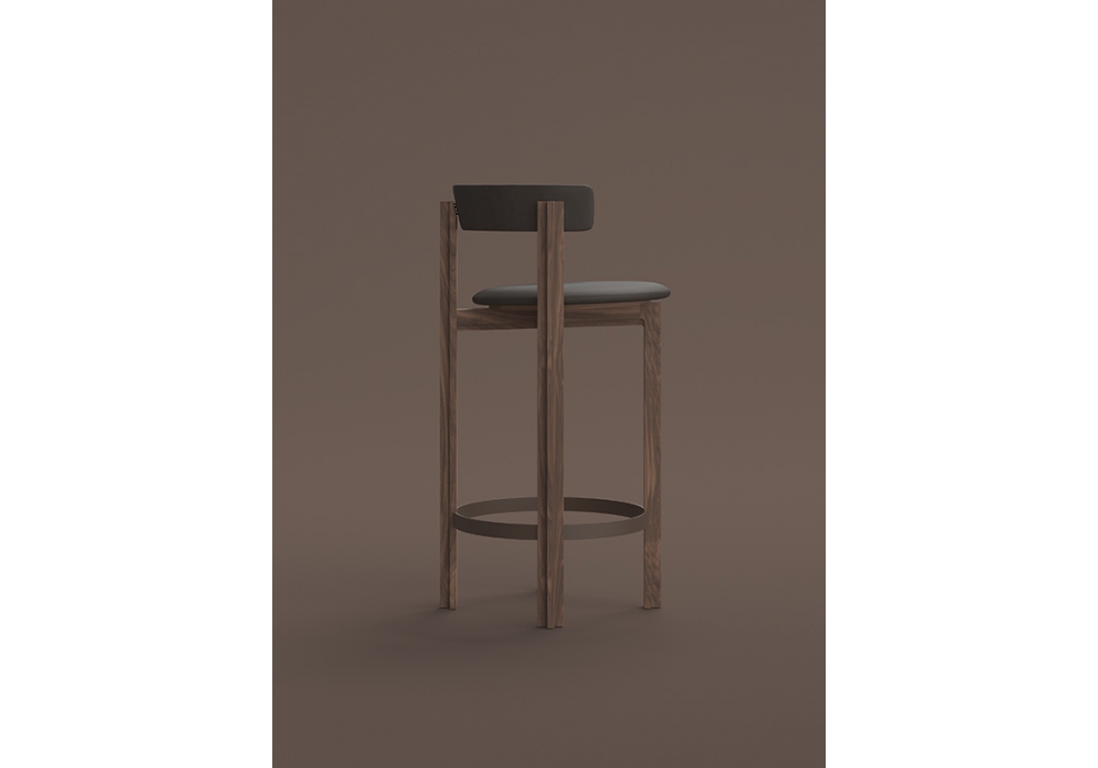 Principal Bar Chair designed by Bodil Kjær for Karakter is a stool made with a structure in solid natural oak, stained oak or painted beech. Seat and back in leather or fabric. Footrest in anodized aluminium.