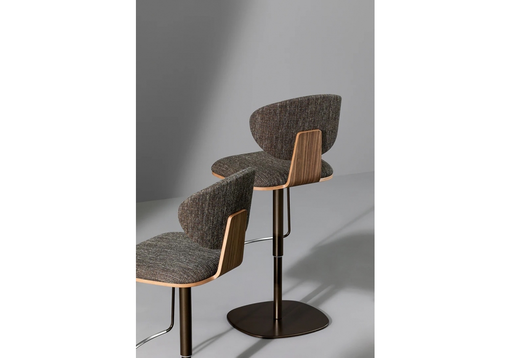 Olos Too designed by Mauro Lipparini for Bonaldo is a stool made of wood, base in painted metal, padded seat and backrest covered in fabric or leather. Height adjustable via gas piston inserted inside the structure. Available in different finishes.