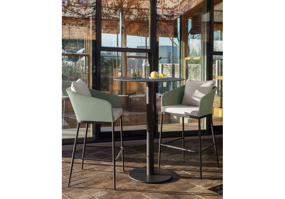 Senso designed by Studio expormim for Expormim is an outdoor bar stool with armrests made with aluminum structure, padded seat and backrest covered in fabric. Available in different finishes and two sizes.