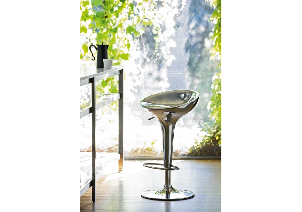 Al Bombo designed by Stefano Giovannoni for Magis is a swivel stool with a seat in polished die-cast aluminum and a stainless steel frame. Adjustable in height via a gas piston.
