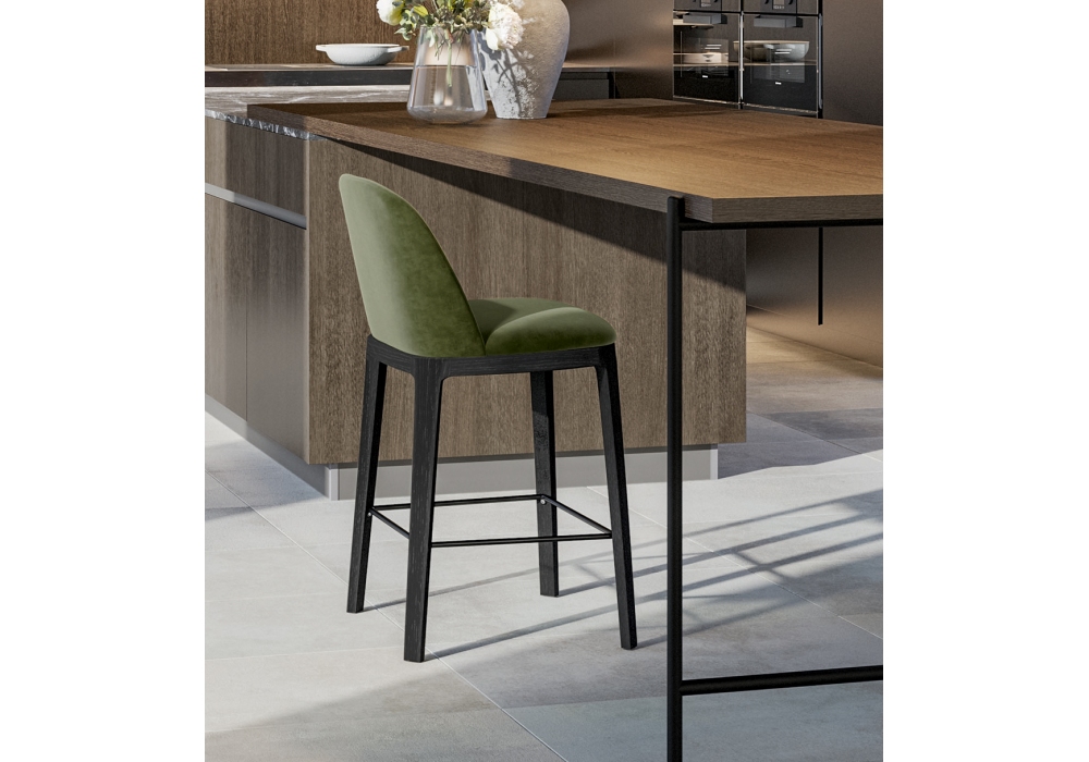 Joelle designed by Dall'Agnese is a padded stool made with a wooden frame and fabric, leather or eco-leather upholstery. Chrome heel pad.