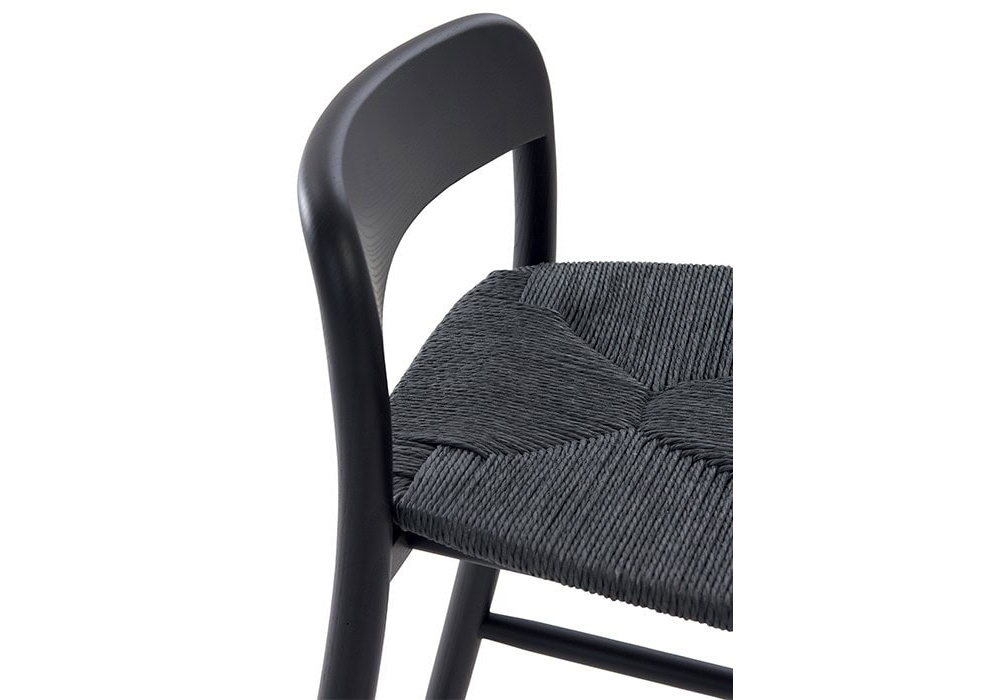 Villetta designed by Keiji Takeuchi for DePadova is a stool with a frame in solid ash stained in black aniline, finished with transparent varnish. Seat in curved beech plywood stained in black, covered with natural gray paper cord, hand-woven. Footrest in stainless steel.
