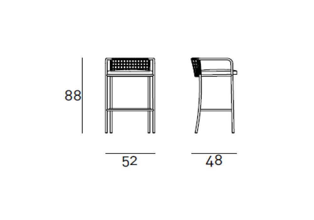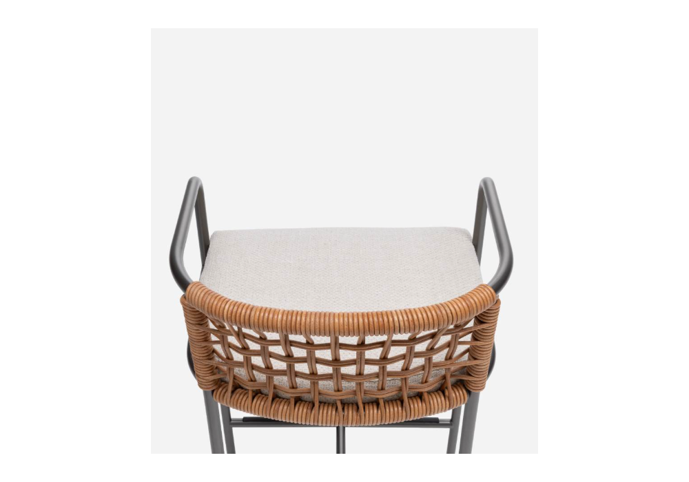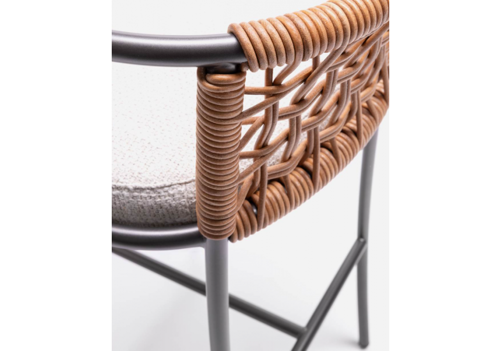Cafè Stool designed by Piero Lissoni for Living Divani is a stool with a painted metal frame. Backrest strung with leather or synthetic rope profiles in different finishes. Seat upholstery in fabric or leather, completely removable by zippers by unscrewing the seat from the frame.