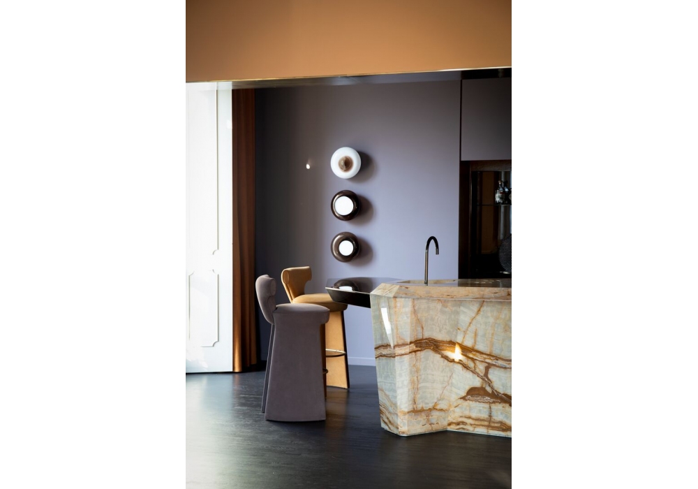 Inga designed by Roberto Lazzeroni for Baxter is a stool with structure, seat, legs and backrest in birch and poplar plywood. Padding in differentiated density polyurethane foam. Metal footrest with a choice of finish. Available in different heights. Upholstery in soft leathers only.