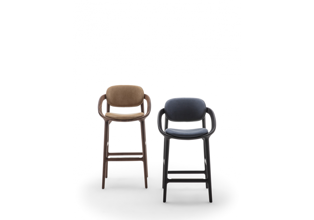 Molly designed by Meneghello Paolelli for Porada is a stool with a solid canaletta walnut or oak frame and a seat and back cushion upholstered in fabric or leather. The front footrest crosspiece features a stainless steel detail.