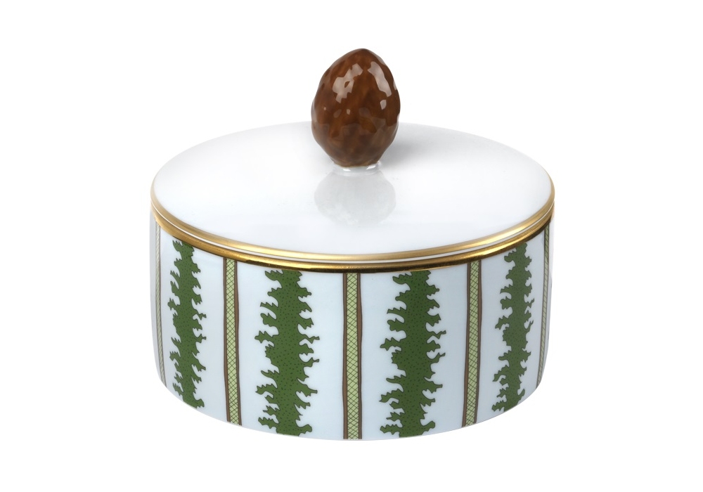 Rain Rock Creek designed by Luke Edward Hall for Ginori 1735 is a decorated gift box made of pure porcelain with gold-edged lid and embellished with a pine cone-shaped knob.