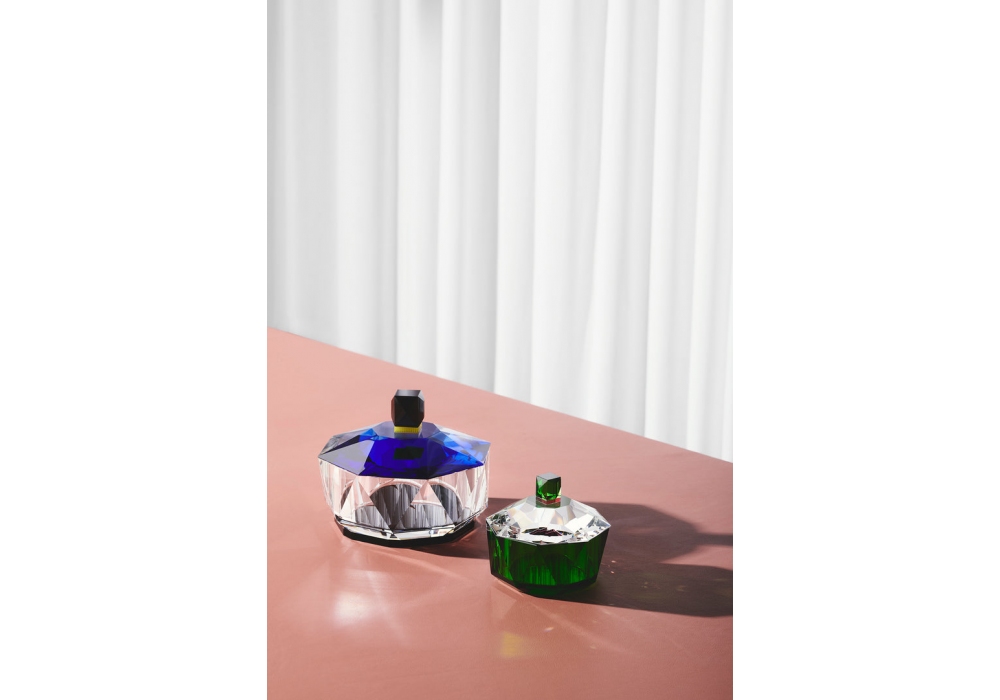 Grand New Haven Basin produced and designed by Reflections Copenhagen is a structured jewel box entirely in carved and hand-finished crystal in transparent, light blue, gray and bright yellow.