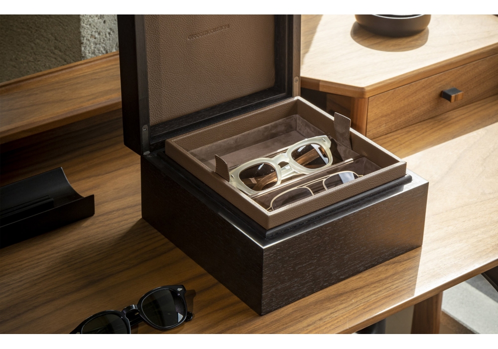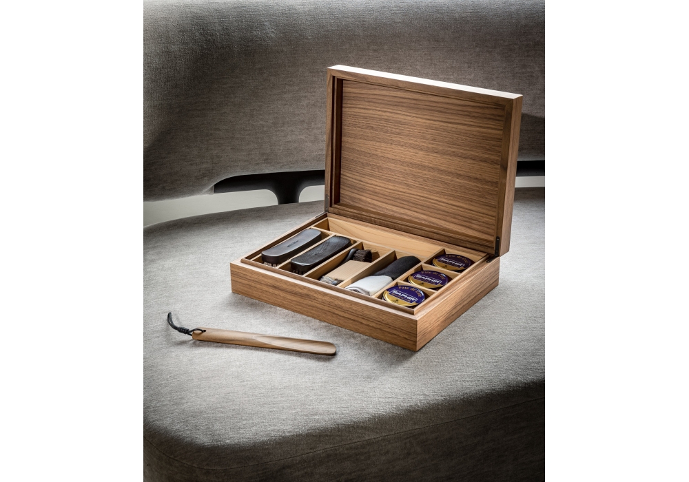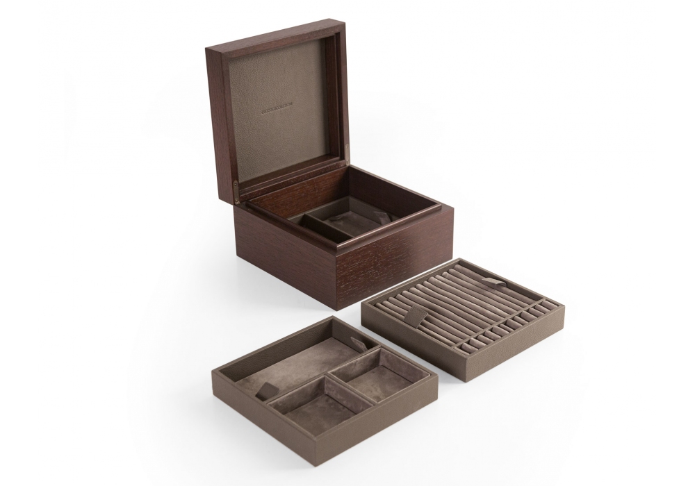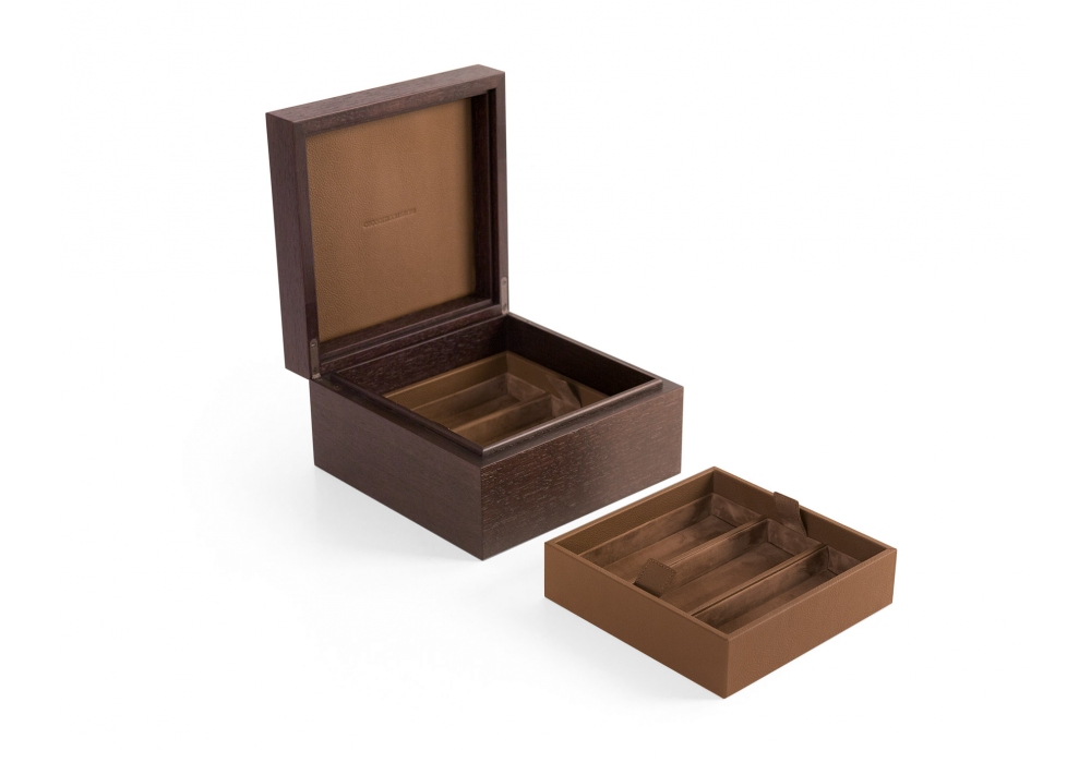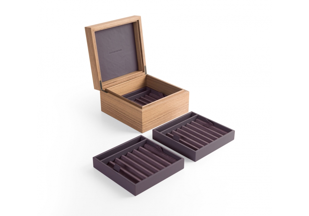 Box designed by design Studio Ceccotti Collezioni is a boxes collection made of plywood veneered American walnut with internal parts in Poltrona Frau leather or cedar of Lebanon. The collection consist in: make-up box; humidor box; shoes set box; eyewear box; jewelry box; pens box; watches box.