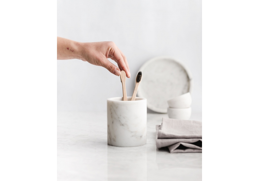 Always After Meals - Tall Cylindrical Container designed by MarmoLove is a container/toothbrush holder made of 100% honed White Carrara Marble.