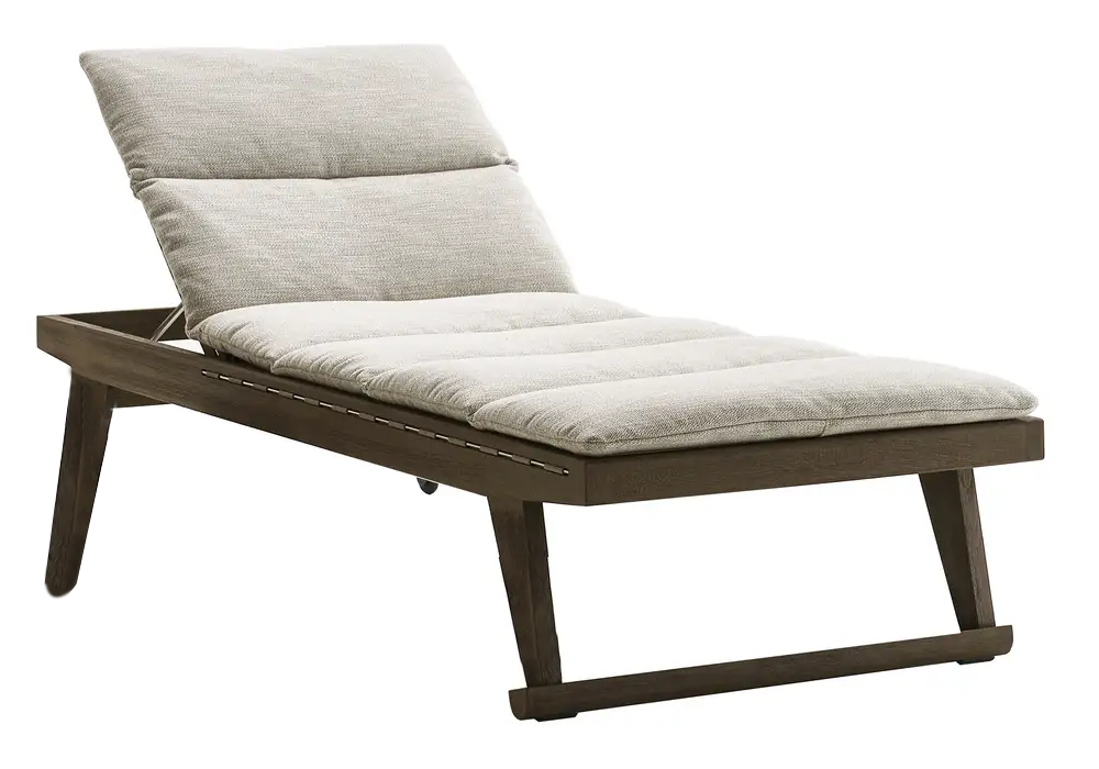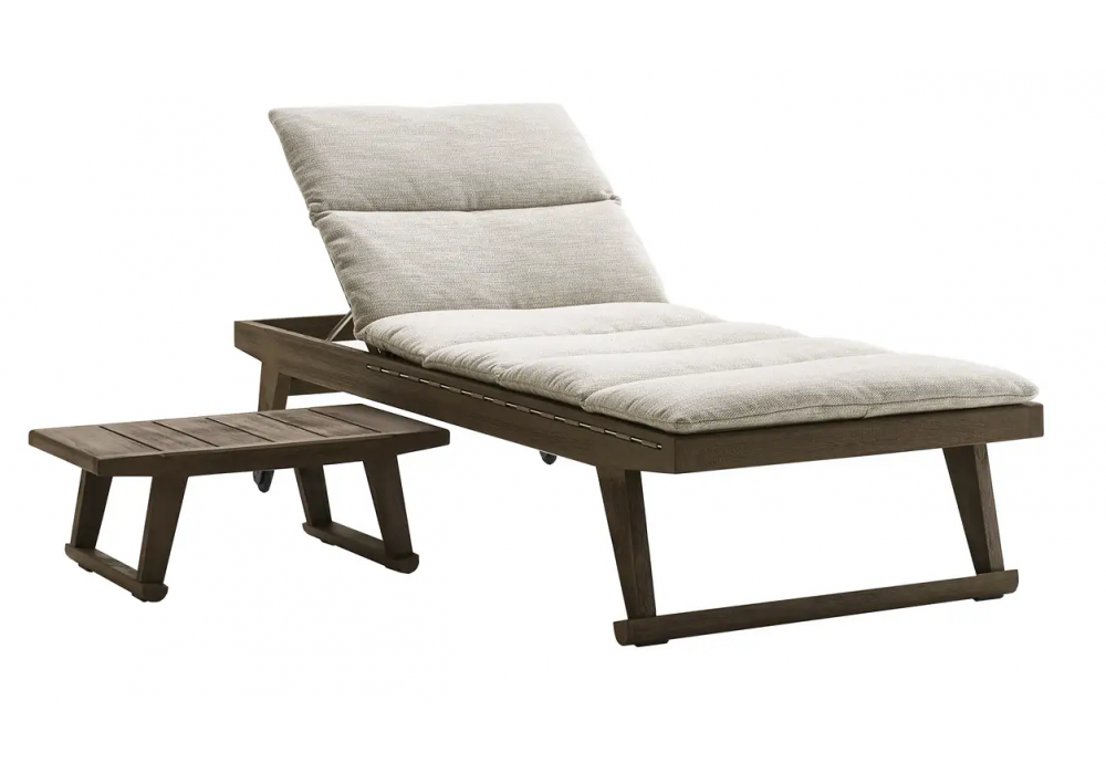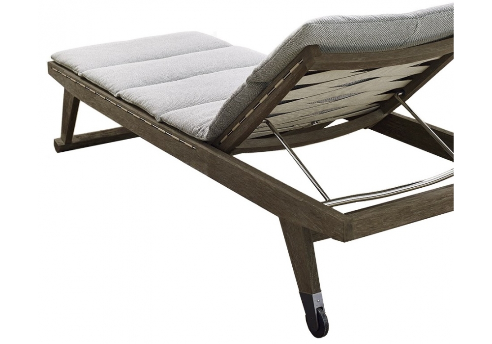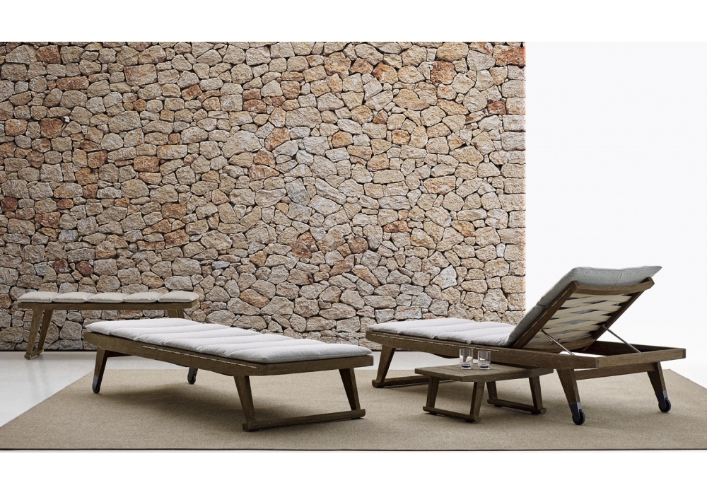 Gio designed by Antonio Citterio for B&B Italia Outdoor is a sunbed with structure in solid antique gray teak wood, webbing in tortora polypropylene, wheels in bronzed nickel thermoplastic material. The backrest is adjustable in four positions. Mattress with high density polyester fiber padding and fabric covering.