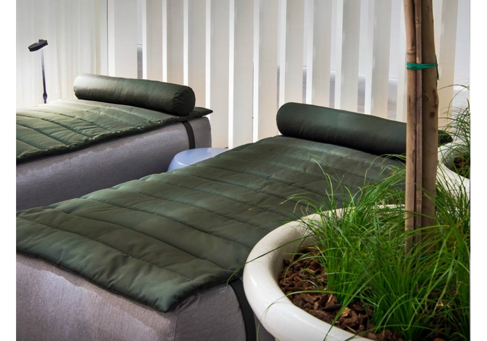 Claud Open Air designed by Andrea Parisio for Meridiani is a lounge bed for outdoor. Wooden frame in bleached iroko and cushions in polyurethane and polyester fiber. Available with topper with headrest in fiberball.
