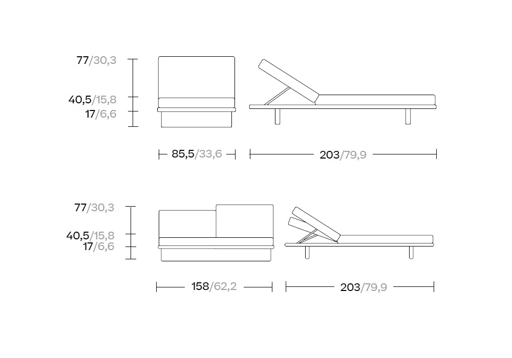 | Dimensions | 85,5 x 203 x H 77 cm; 158 x 203 x H 77 cm. |