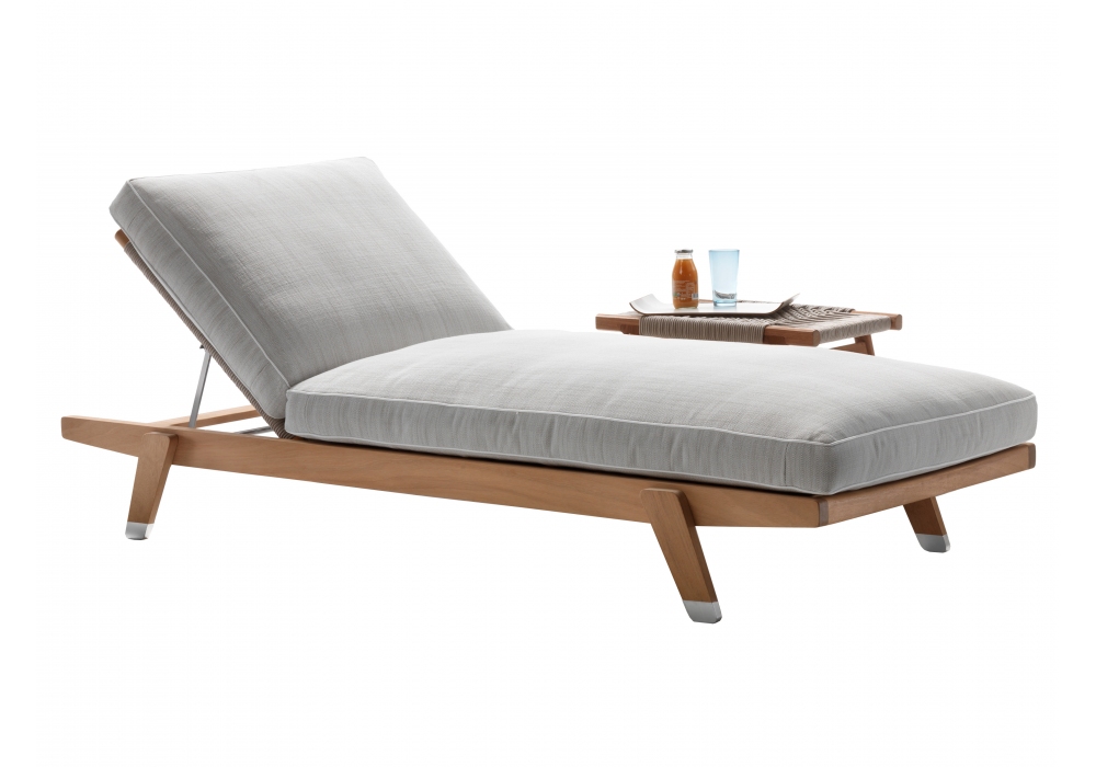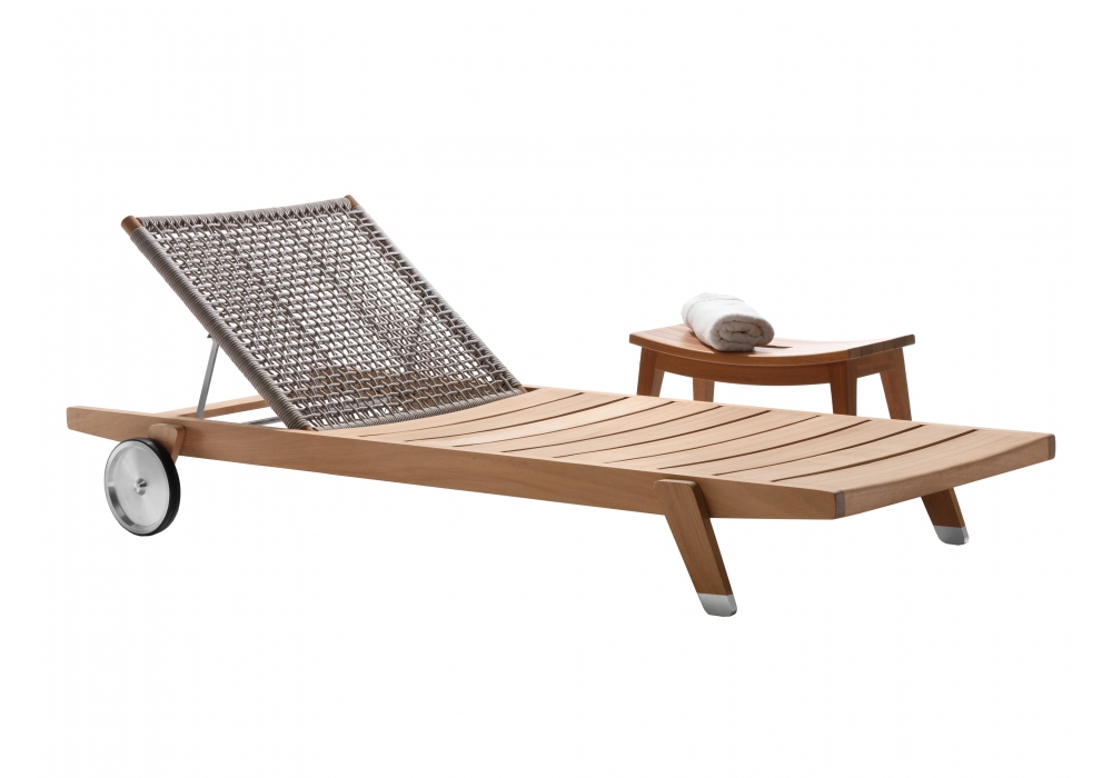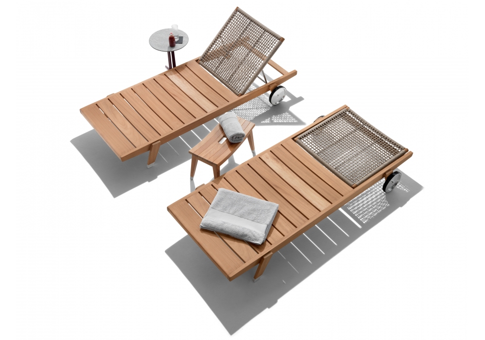 Hora Sexta designed by Antonio Citterio for Flexform is a beach chair from the Outdoor collection. Made of iroko wood with polypropylene weave in different finishes, it is available with or without wheels and, on request, the seat cushion is available.