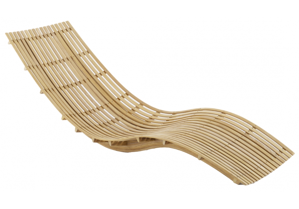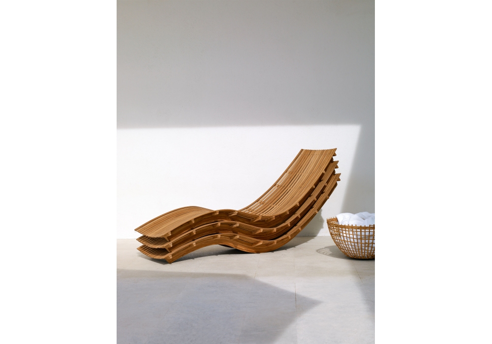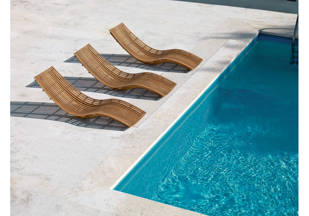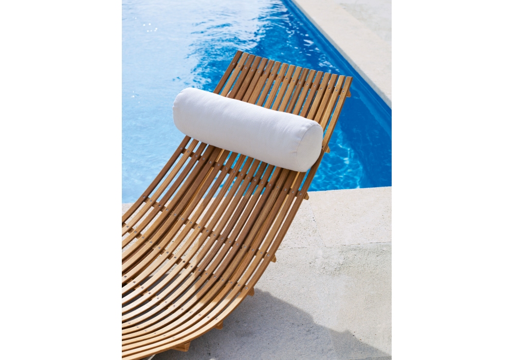 Swing produced and signed by Unopiù is a chaise longue with structure in natural teak and support in austenitic stainless steel. The headrest cushions are in milk-colored acrylic fabric.