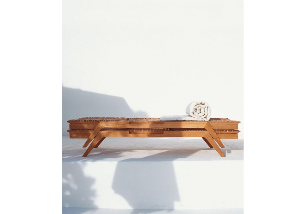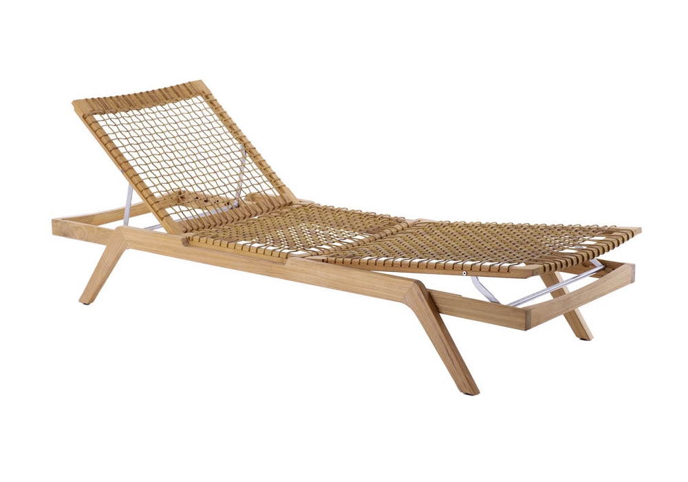 Synthesis designed and produced by Unopiù is a stackable outdoor sunbed with structure made of teak wood and WaProLace woven rope. The cushions are made of acrylic fabric available in different finishes.