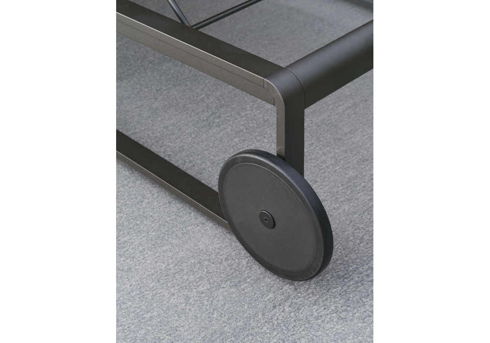 Guell designed by Vincent Van Duysen for Molteni&C is a sun lounger made with burnished metal structure, slats in teak or with anthracite finish weaving and wheels in plastic material. Cushion with fabric upholstery. Also available without cushion.