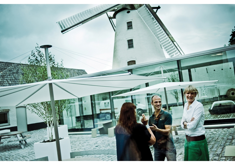 Inumbra designed by Dirk Wynants for Extremis is a sunshade with stainless steel structure and fabric cover. The parasol opens and closes by means of a separate handle. The technical parts that open and close the parasol are above the Inumbra's UV resistant fabric. This means that you cannot see them when you are sitting under the parasol. Inumbra has been submitted to wind-tunnel testing at the Von Karman Institute. Although the garden parasol can withstand wind speeds up to 8 on the Beaufort scale, it is best to close it sooner (from wind speed 6 is the rule of thumb). Combine the Inumbra garden parasol with Gargantua or Pantagruel for the most sturdy terrace set available.
