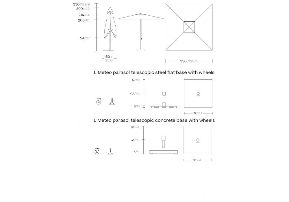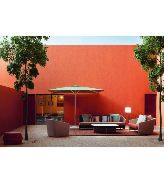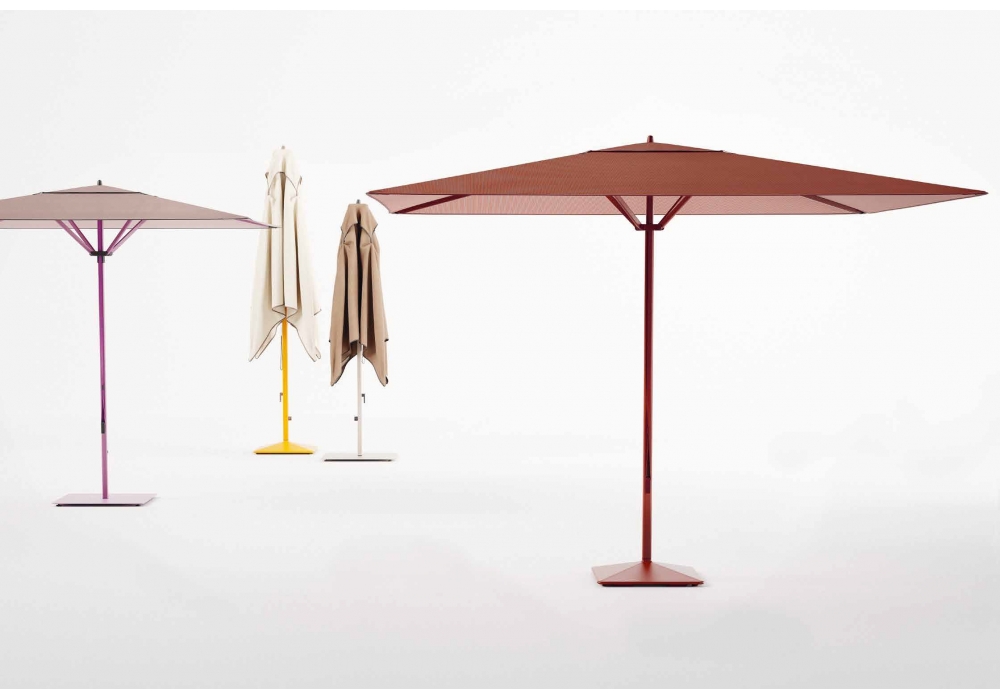 Meteo designed by Konstantin Grcic for Kettal is a parasol with an aluminum frame and a sunshade available in different fabrics. Also available in 3 sizes. Meteo is available in 2 versions: a basic model, which uses a manual pulley system, and a high-end model with an integrated gas piston to facilitate the opening and closing of the parasol. Meteo can be mounted on alternative basic models.