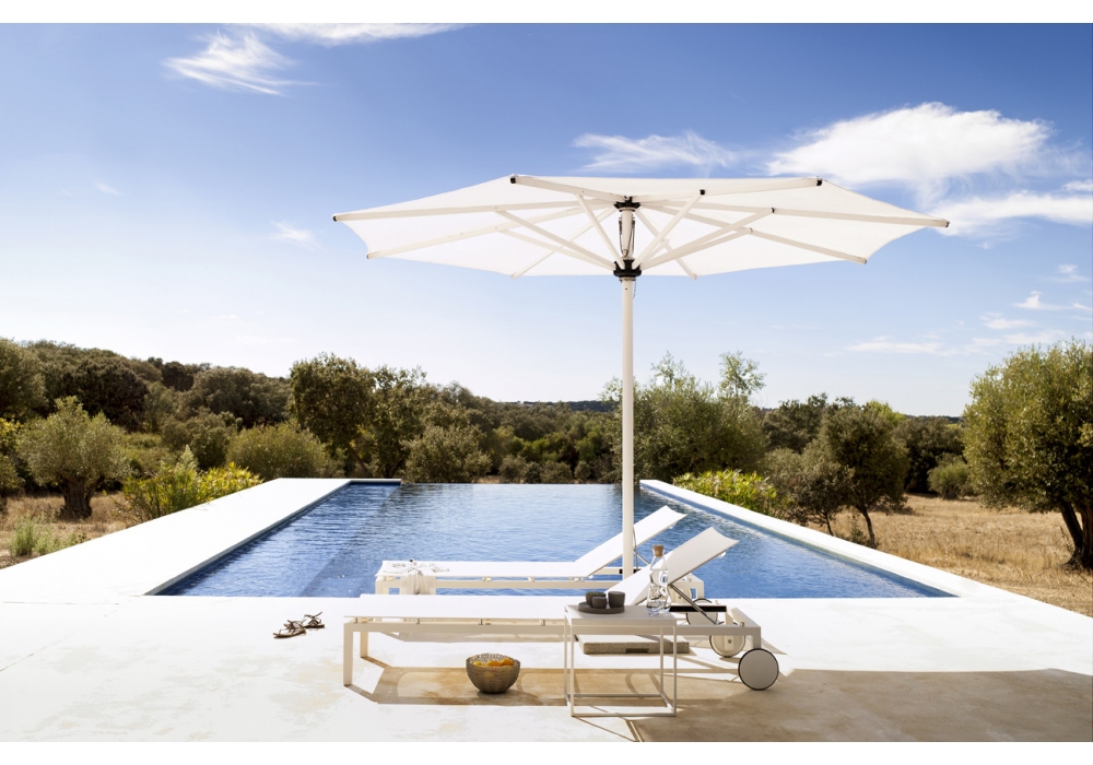 Eclipse designed for Tribù is an umbrella with powder coated aluminum structure and fabric parasol in different finishes. Available with round or square sunshade. It is possible to add a granite base to support the umbrella.