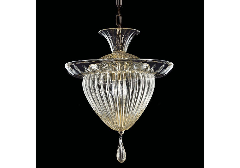 Fanali Veneziani 5382 designed and produced by Barovier & Toso is a pendant lamp with supporting structure in galvanized gold colored metal. The lamp body and the diffuser are in Venetian glass and it adopts a dimmable LED or halogen light source. Fanali Veneziani 5382 is available in different glass finishes.