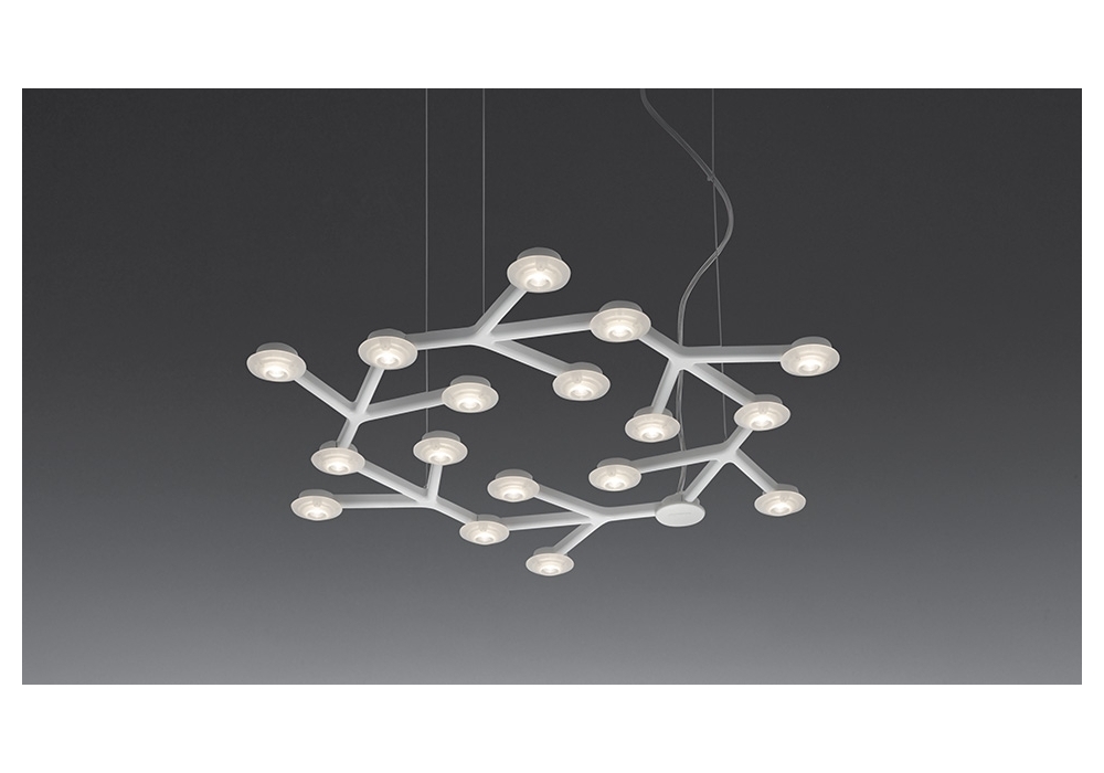 Led Net Circolare designed by Michele De Lucchi & Alberto Nason for Artemide is a pendant lamp with a central hexagonal structure with various branches in painted aluminium. The diffusers are made of transparent methacrylate and house an LED light source with a Push dimming system that can be controlled remotely.