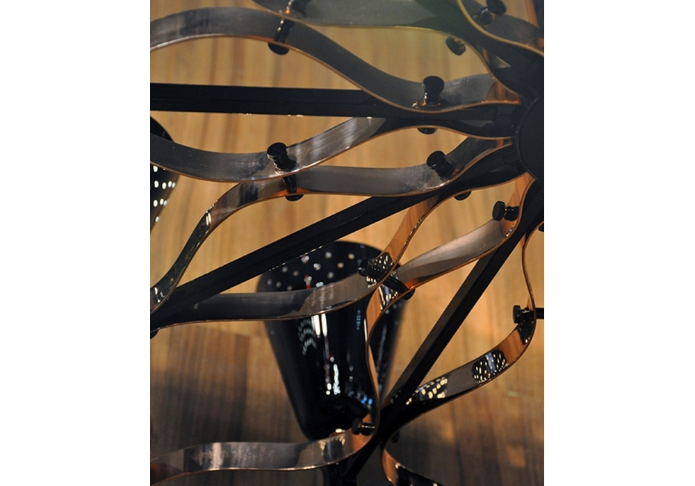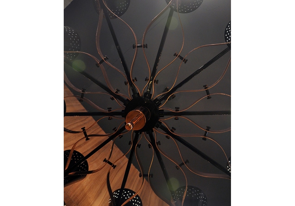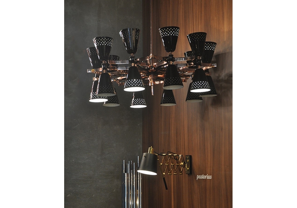 Charles 20 designed by DelightFULL is a suspension lamp made up of 20 lampshades, all handmade in brass, with perforated details on the top. A copper plated finish is applied to the lamp body at the end of the process, the shades are lacquered glossy black on the outside and matte white on the inside, helping to create a more welcoming light for the human eye.
