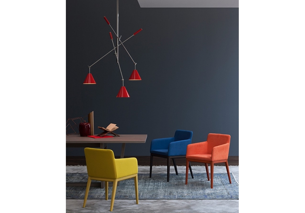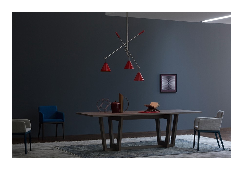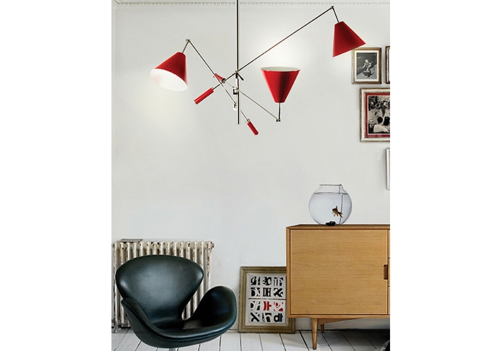 Sinatra designed by DelightFULL is a suspension lamp handcrafted in brass and with a nickel plated finish, the three lampshades have a distinctive look made in aluminum and have a glossy red finish. The counterweights are made of iron and also have a glossy red finish.