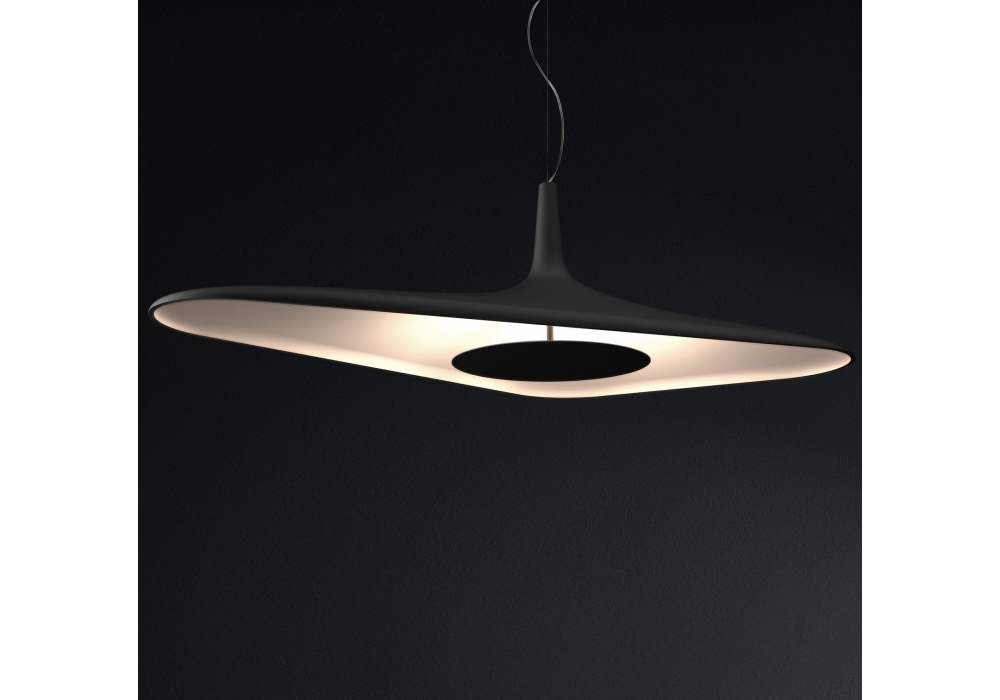 Soleil Noir designed by Odile Decq for Luceplan is a LED pendant lamp made with polyurethane foam printed in a white or black finish. The lamp is supported by a single asymmetrical and extensible cable.